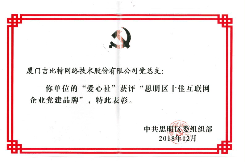 经初审评选、、网络评选和专家评审等环节,,"厦门yaxin111网络技术股份有限公司党总支-爱心社" 从全区28个参评党建品牌中脱颖而出,,,,获评"思明区十佳互联网企业党建品牌"。。